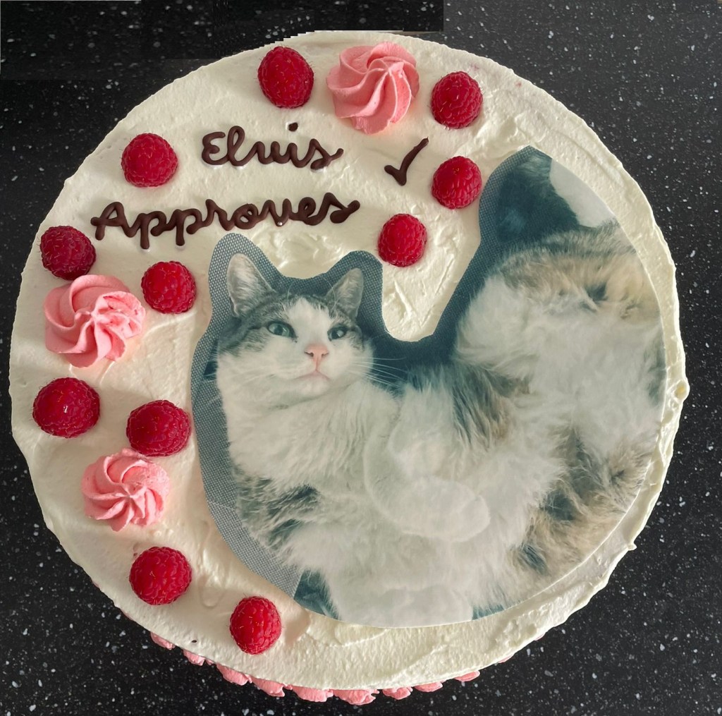 Rotes Vanille Biskuit mit Himbeer-Mascarpone Creme Füllung und Rahm. Eigenes Bild, Schriftzug aus Schokolade und Früchte.